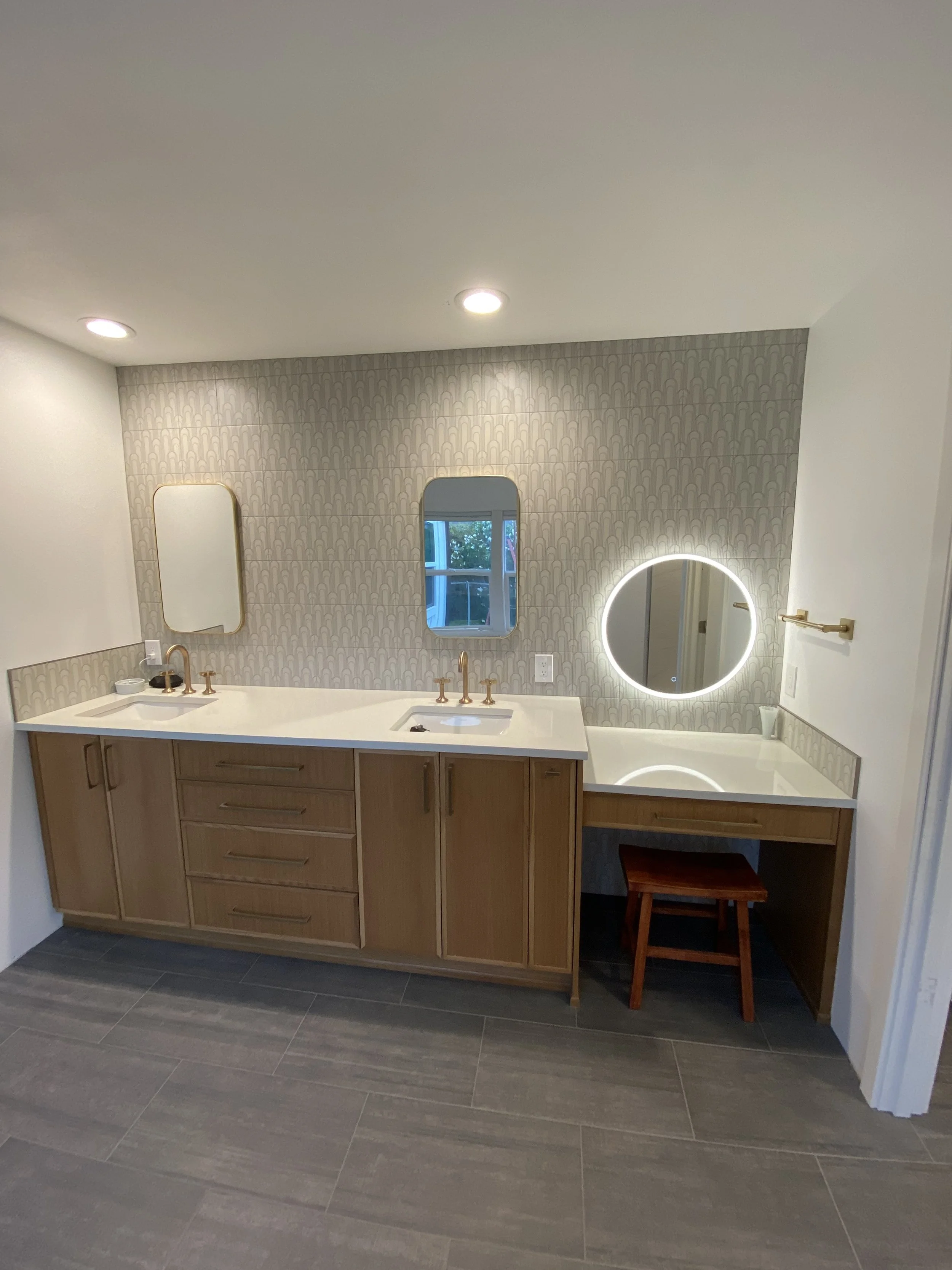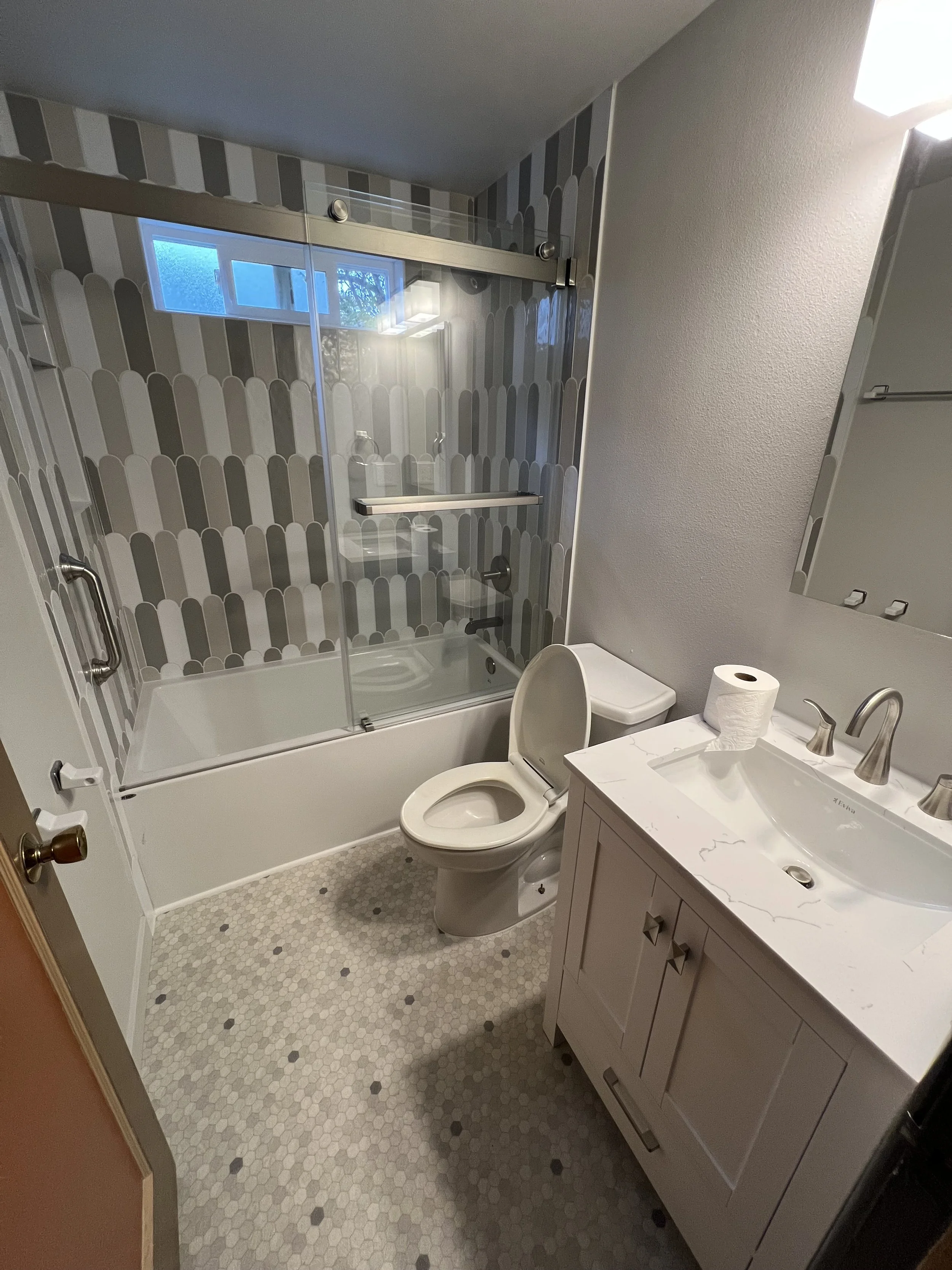 Quick and painless Bathroom remodels typically finished in 2-4 weeks. This bathroom to the right took 6 weeks as the entire exterior wall was rain damaged. We had to remove and replace all framing, window, siding and insulation. Replaced and leveled the sub floor, entire room drywall refresh, all new plumbing and electrical w/ new ceiling fan, tub and tile, flooring, vanity etc.